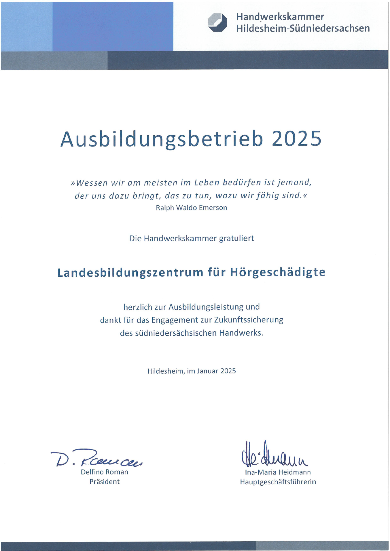 Die Handwerkskammer Hildesheim-Südniedersachsen hat uns als Landesbildungszentrum für Hörgeschädigte zum Ausbildungsbetrieb 2025 ausgezeichnet und bedankt