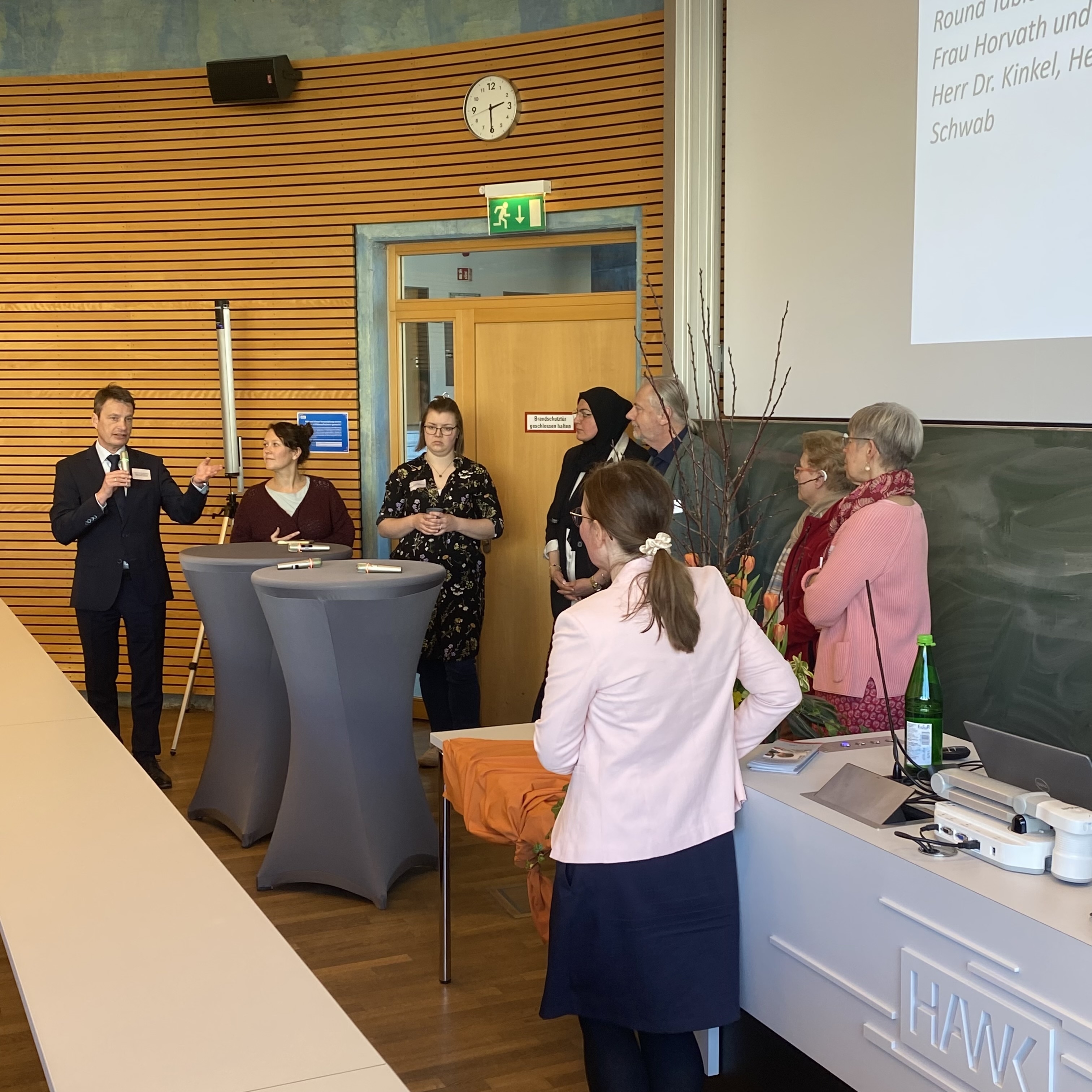 Schlussendlich mündete diese Diskussion in einen Round-Table mit allen Beteiligten. Hervorzuheben sind an dieser Stelle aber besonders Frau Horvath (Lehrerin am LBZH), Frau Marji (Mutter zweier hörbeeinträchtigter Kinder) und Frau Marianna Bahrmal (Deutschen Schwerhörigenbund, Landesverband Niedersachsen), die mit ihrem Erfahrungswissen gezeigt haben, vor welchen Herausforderungen Angehörige und Betroffene stehen. Die Diskussion aller bildete einen inspirierenden Abschluss des Fachtags und trug zu Netzwerkbildung über die HAWK hinaus bei.